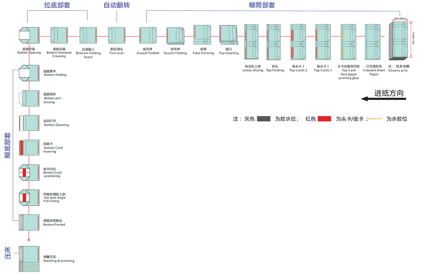 一次性完成折袋口, 糊筒,折底,放底卡, 底部上膠封合等紙袋工序和工藝;